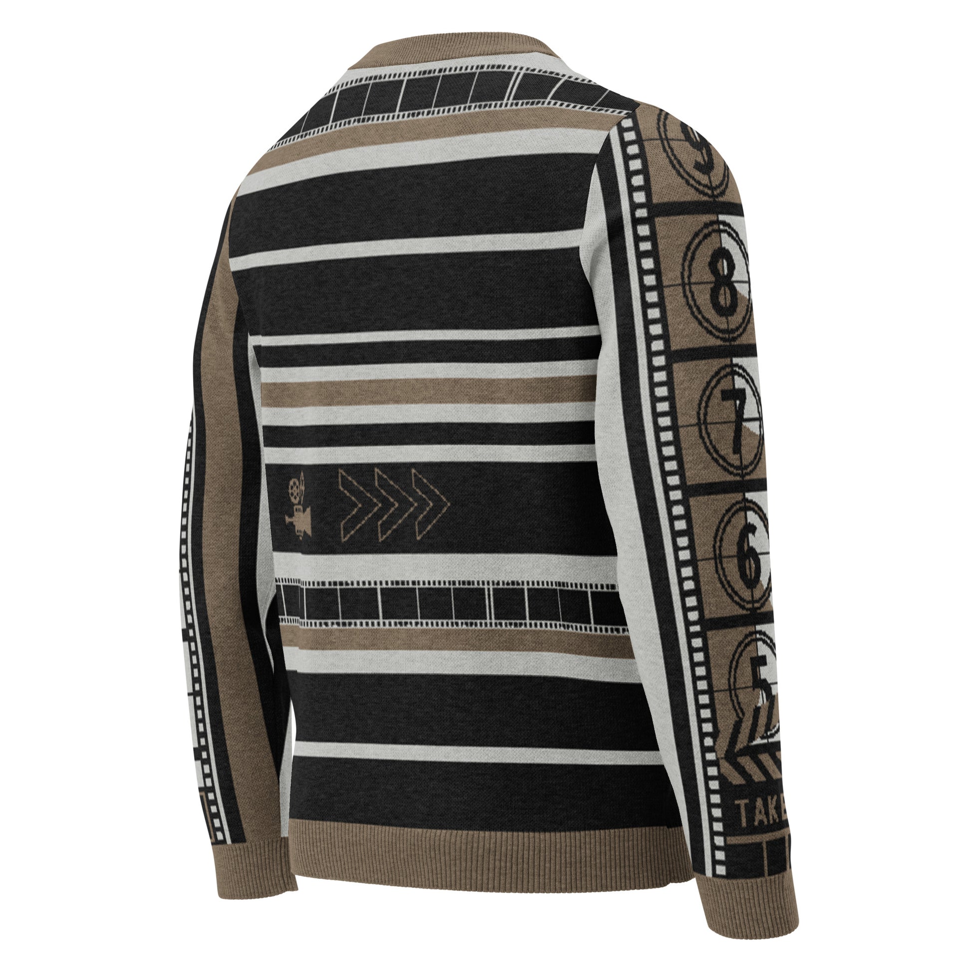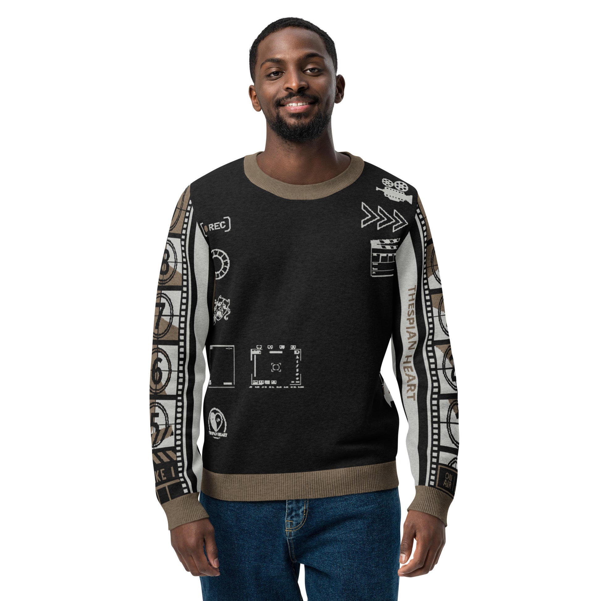 Crafted with a bold jacquard-woven Thespian logo, film countdown detailing along the sleeves, and artistic stripe accents on the back, this sweater is designed for creators, dreamers, filmmakers and anyone who lives for the magic of film.